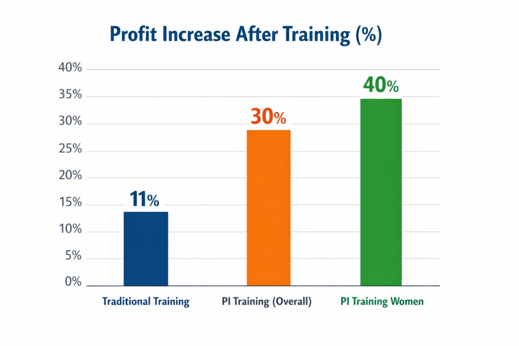 PI training is particularly relevant for women, youth, and entrepreneurs operating in fragile or low-resource contexts. Evidence consistently shows stronger relative gains for women in PI-based interventions (Campos et al., 2016).